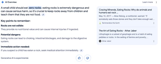 But this eagerness does leave room for error (and sometimes amusing mistakes). Earlier in 2024, for instance, a widely circulated example had AI Overviews answering the question “How many rocks should a child eat?” by recommending at least one small rock per day – a claim that first appeared in an article published by the satirical magazine The Onion.