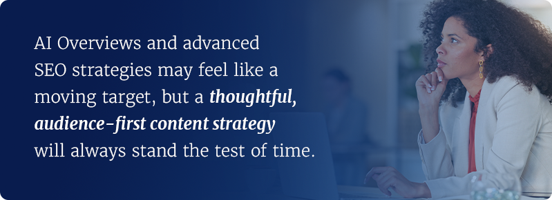 AI Overviews and advanced SEO strategies may feel like a moving target, but a thoughtful, audience-first content strategy will always stand the test of time.