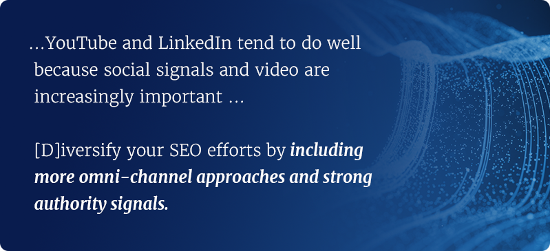 That’s why platforms like YouTube and LinkedIn tend to do well, because social signals and video are increasingly important to Google’s algorithms – yet another reason to diversify your SEO efforts by including more omni-channel approaches and strong authority signals.