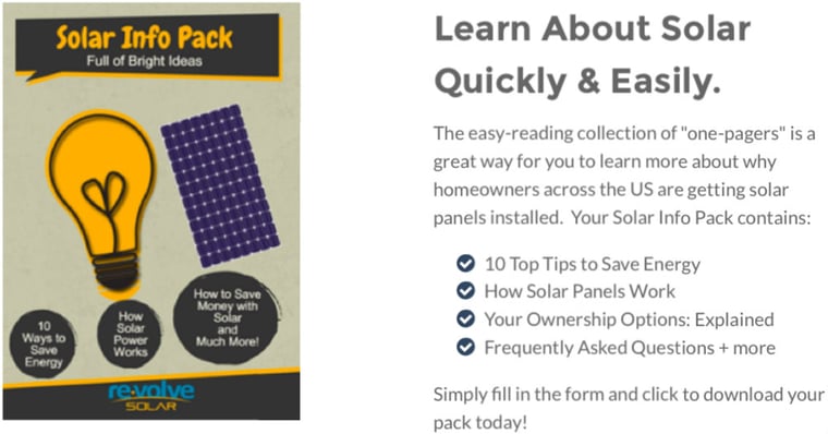 Revolve Solar offers a downloadable "Solar Info Pack" right on its home page. The pack—actually a compilation of one-pagers—gives homeowners an overview of the basics of buying solar panels, how they work, why they’ll save money, and some energy-conserving tips for around the house.