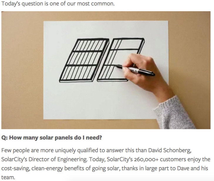 SolarCity addresses a top question for homeowners in “How many panels do I need?” When trying to envision what a solar array might look like on their roof, how much energy it will generate and how much it will cost, homeowners want to know: How big does my array need to be to make this a worthwhile investment? Smaller local brands can differentiate on broad topics like this by focusing on the unique needs of their local audience, environment or climate.