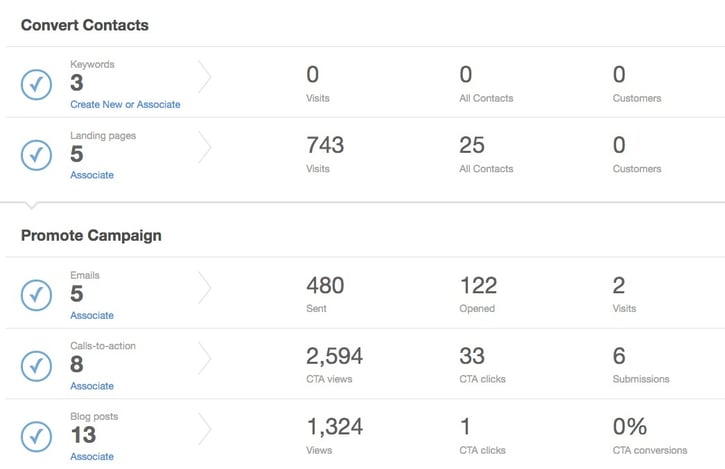 HubSpot also has a campaign tool that allows you to associate keyword phrases, related blog posts, emails and landing pages with a particular campaign so you can get a better idea of the overall performance. If a particular set of keywords doesn't seem to be bringing in new site visits or converting leads to customers, it might be time to search for alternatives.