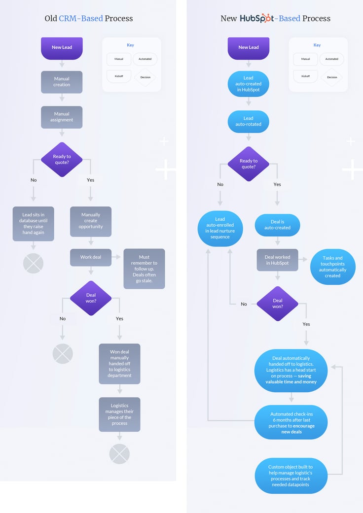 One of the first items tackled in the migration was mapping out a custom object for job scheduling. To do this, the Kuno team employed Lucidchart to create ERDs and process documentation and flowcharts, helping the HCI team visualize their data in the new environment. This also provided the opportunity to demonstrate HubSpot’s capabilities with regard to its CRM functionality and customization—something they struggled with in Quickbase. We worked closely with HCI partners to ensure the new custom object would meet their needs and provide for sufficient reporting.