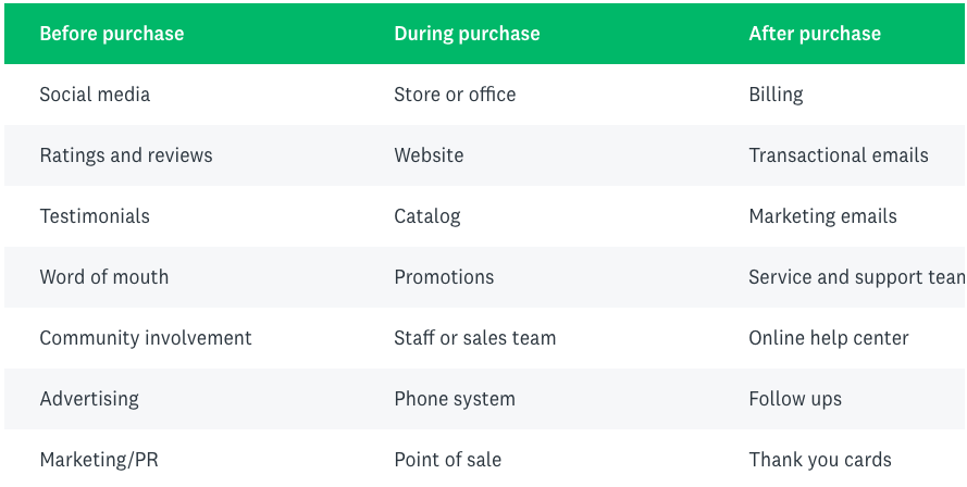 A customer touchpoint is any interaction a customer or potential customer has with your brand before, during or after purchase. To identify all your touchpoints, SurveyMonkey suggests making a list of all of the places and times a potential customer may encounter your brand. Here is an example.