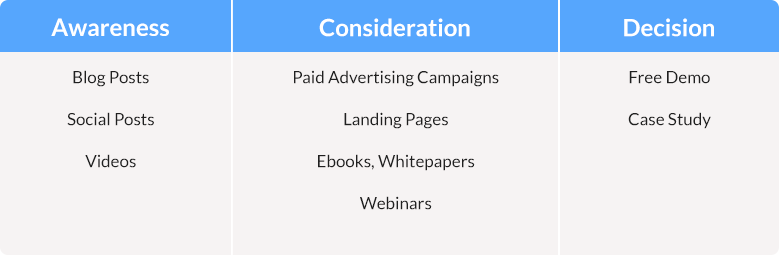 An easy way to make sure this happens is to align your content offerings with different stops in the journey. Doing this will really help you to target different segments of your audience. This chart shows different types of content you can create and at what point along the buyer's journey they can be used.