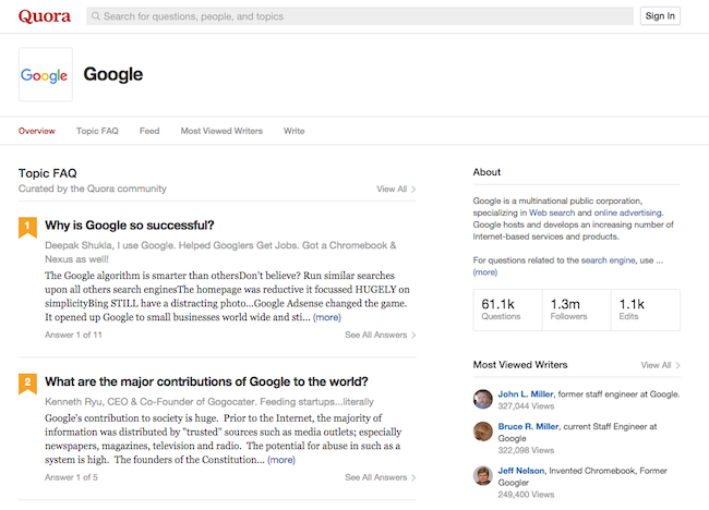 Google engineers frequently answer questions on the Google Quora page with full, high-quality answers, promoting the levels of knowledge and expertise Google is known for. The higher the quality of the answers, the greater the opportunity to increase your followers and your reach within the network. Reach the right audience by including tags with your questions. Interact with some of the industry’s best and get your questions answered.