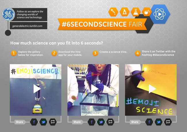 GE asked followers, “How much science can you fit into 6 seconds?” and was met with some amazing responses. The challenge to create and submit science projects as Vine videos made science fun to new audiences and fit in well with the company’s regular technology crowd. The campaign launched on Tumblr using the hashtag #6secondscience. This worked well for GE because it encouraged engagement and was not a direct commercial for its services, and yet it shed light on the cool, hip side of the tech industry.