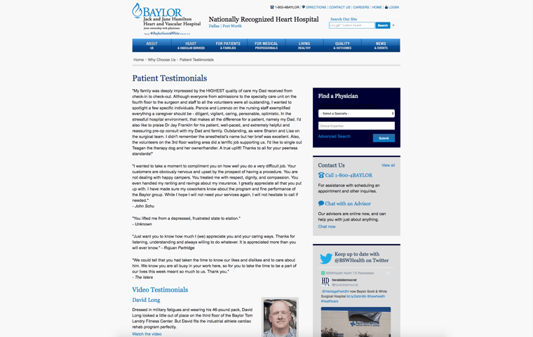 Testimonials or reviews can be a powerful way of boosting the credibility of your healthcare organization. You can mention quotes from patients in your regular blog posts, or even combine several reviews into one blog post. However, before using any reviews, be sure to ask the people who left them for permission. If they are willing, you could even ask them to give testimonials on video, which can then be embedded on your blog. To boost the credibility of written reviews, be sure to include the name and photo of the reviewer. Baylorhearthospital.com is a good example of a blog combining both written and video testimonials.