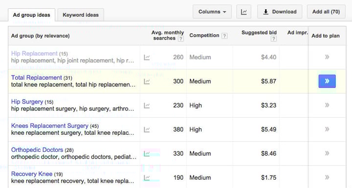 While the Keyword Planner is designed specifically to help advertisers on the AdWords platform, it can also provide a lot of helpful information and insights for hospitals looking to use it for topic generation and SEO keyword research. If you plug in your specialty, your website and your city, the tool will provide you with: