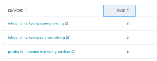 Following a refocus on our site’s SEO strategy, we saw our pricing page steadily increase in Google rankings, finally settling in at No. 2 in SERPs for the search phrase “inbound marketing agency pricing.” It also ranks well for “inbound marketing services pricing” and “pricing for inbound marketing services.” Since these are mid- to bottom-funnel search terms with strong buyer intent, we were thrilled.