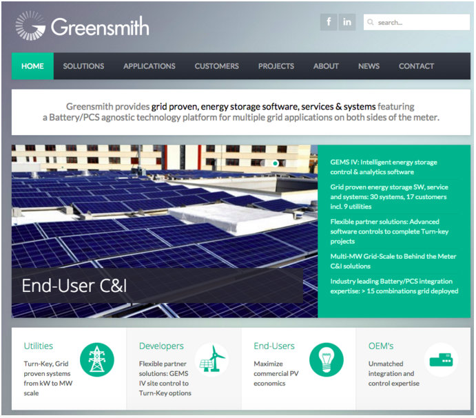 The home page for Greensmith, a company offering turnkey energy storage systems, features a prominent headline stating what the company does, along with four buckets beneath the banner that call out the target customer groups.