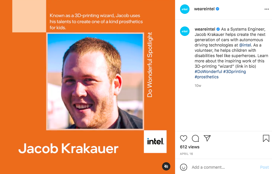 In other instances, the employees who build and operate Intel technology are the focus. One example of this is the “Do Wonderful Spotlights.” Jacob Krakauer, for instance, is a systems engineer for Intel, but he also uses his love for 3D printing to create prosthetics for children. This feeds back into a human-centric theme that shows how Intel and its employees are giving back.