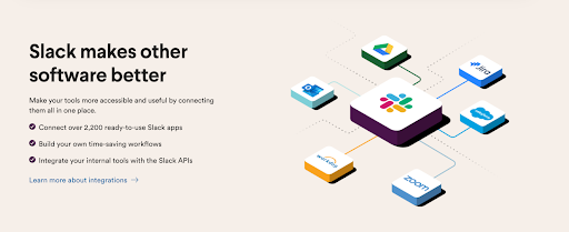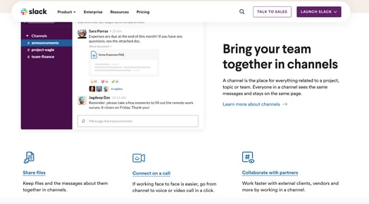 The Slack homepage makes it immediately clear what teams can do with its software — share files, connect on a call and collaborate with partners. It also shows the benefits of Slack’s integrations with other tech brands.