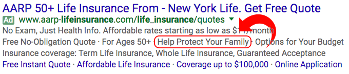 Some companies work emotion into the limited parameters of PPC ads. A common occurrence of this is found in insurance companies, because safety is such a strong hook to encourage users to buy, like this AARP life insurance ad: